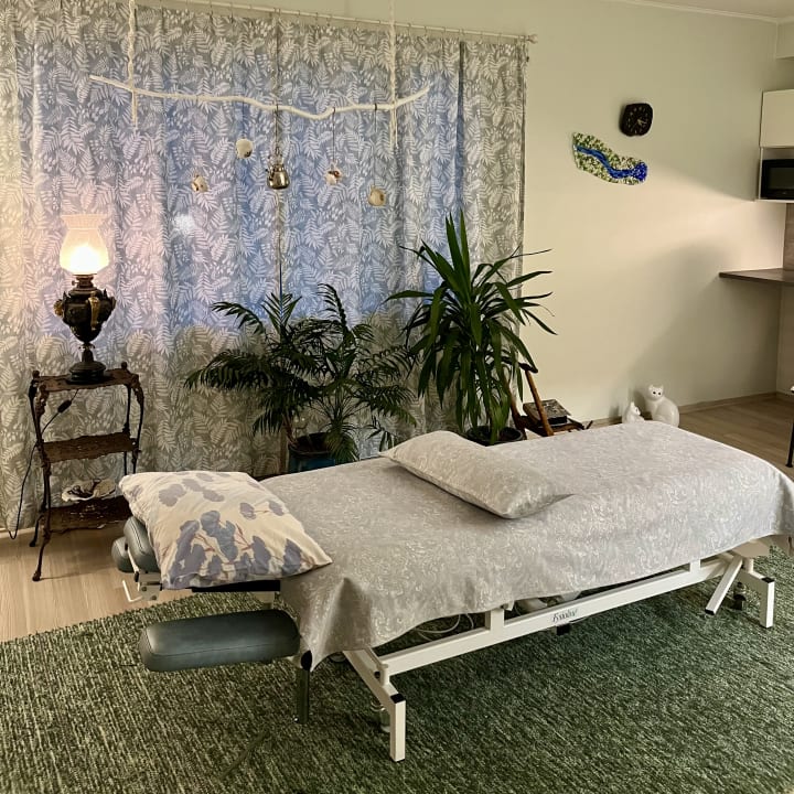 Rauhallisessa hoitohuoneessa teen keho-ja tunnevyöhyketerapiaa, kuumakivihierontaa ja jalkaterien hierontaa sekä intialaista päähierontaa, joko omana hoitonaan tai osana hiusten energialeikkausta.
